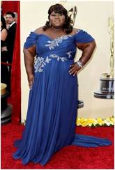 I don’t think there was enough talk about Gabourey Sidibe’s dress and the little bit I did see wasn’t positive. I thought her dress was fitting for her. Lets keep it real. It’s hard to find formal wear for big girls and Sidibe is a big confident girl. Her dress was a nice color for her. African Americans look good in jewel tones, i.e. emerald and sapphire. Like Latifah’s dress her flower crystal detail was broken up. The off the shoulder sleeves created a sexy look while at the same time hiding her arms. While Sidibe may not be on the Oscar 2010 best dresses list her dress was perfect for her.